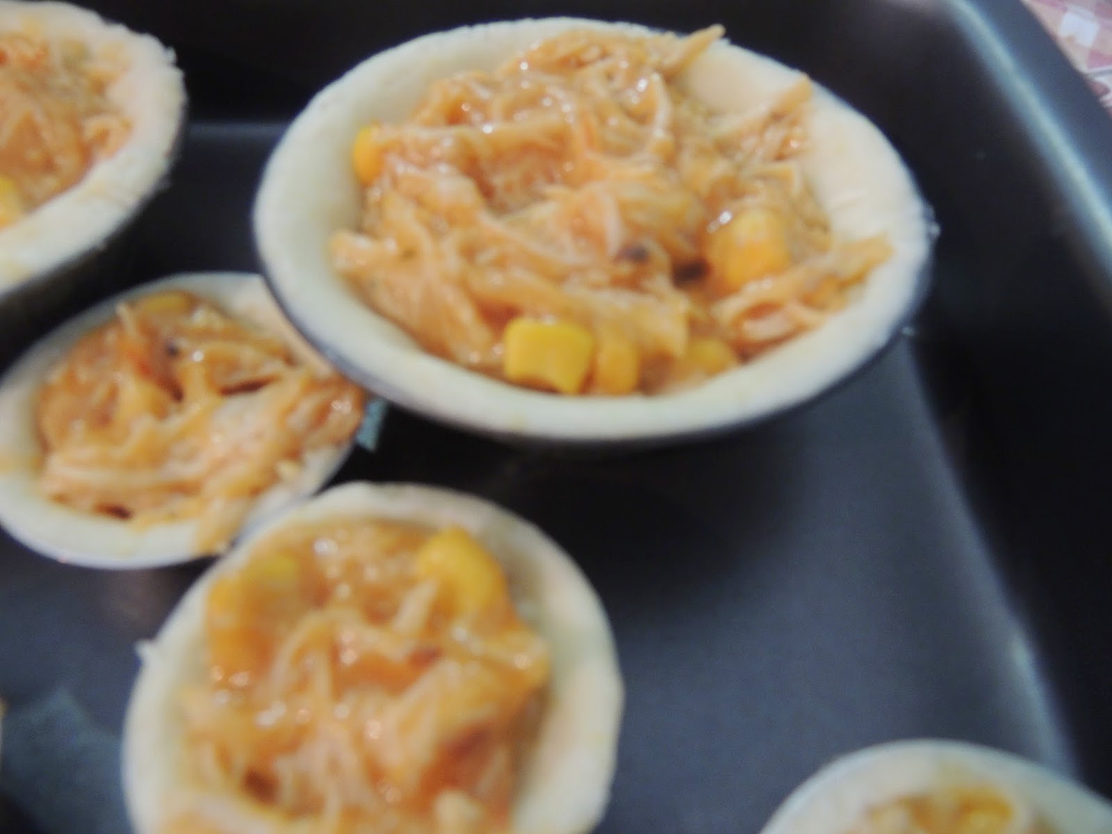 Eu cozinho o peito de frango, desfio, adiciono um pouco da água que cozinhei o frango, molho de tomate, milho, azeitona. Refogo bem e coloco um pouco de amido de milho para engrossar (fazer um creme bem molinho).